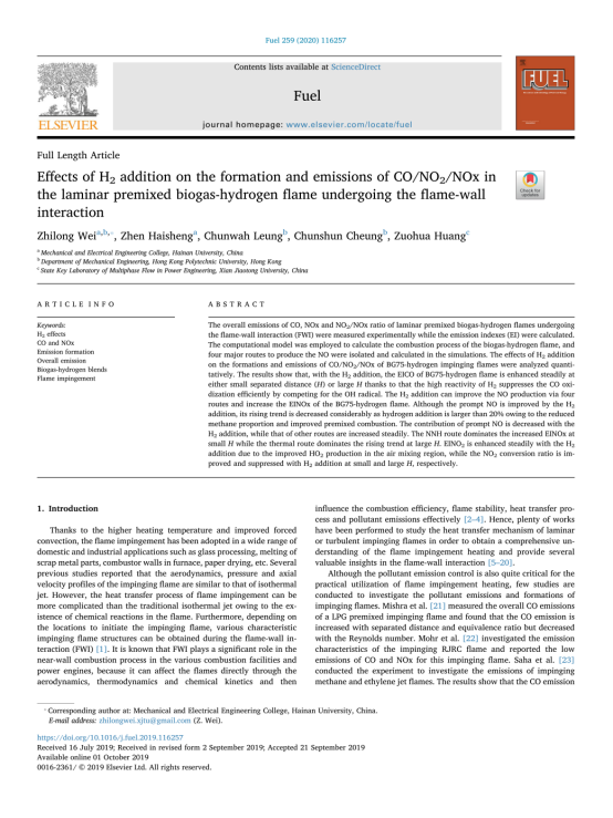 研究团队目前针对生物质气-氢气可再生能源的清洁高效利用,开展了广泛的基础应用研究,促进了对该可再生能源基础特性的认识和理解,为该可再生能源的清洁高效利用提供了多方面的理论支持。该研究得到了香港RGC项目(B-Q39F)和海南大学科研启动经费(KYQD(ZR)-1905)资助。