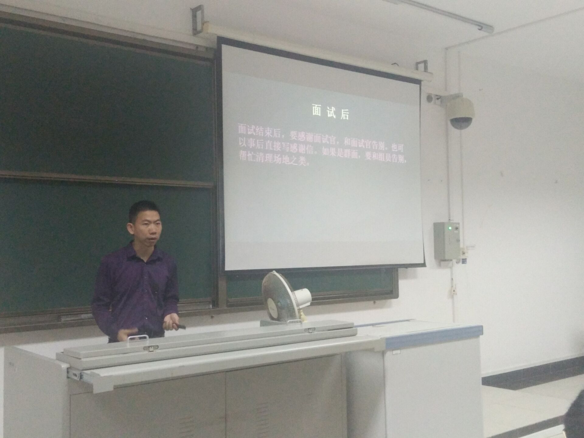 2017年5月9日,英国上市公司365职业指导专题讲座在三教学楼309教室成功举办。出席活动的有星火教育招聘专员杨志浩老师、学工办主任崔建兵老师、年级辅导员傅悦老师,2014级及报名求职模拟面试的同学近200人参加。