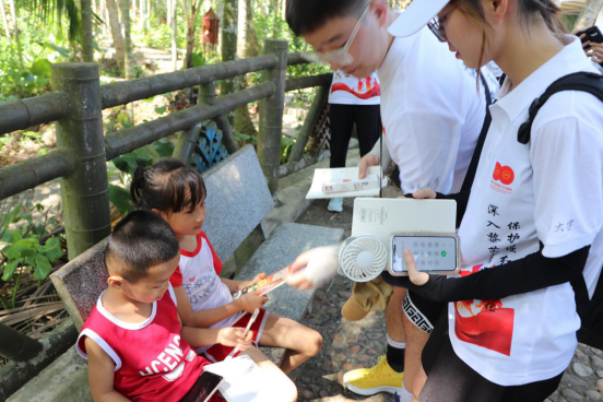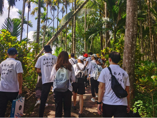 下午13点30分,调研团出发前往第二站——会山镇加脑苗寨。抵达目的地后调研团在村民委员会主任引导下进入苗寨。走访调研途中,调研团成员在村民委员会主任的介绍以及讲解下学习了解到部分苗族传统习俗。三月三青年男女对歌恋爱,由于加脑苗寨邻靠万泉河,三月三的传统习俗在这里与万泉河有了紧密的联系,青年男女以生生不息的万泉河为见证者来互表爱意;苗族人民崇尚自然,敬畏自然,他们深信万物有灵,在加脑苗寨也有着一棵树,承载着他们村里苗族人的信仰,那是村庄里年龄最大的一棵树,这颗年岁颇高的树被村中人敬称为“树神”,每逢过节,村里的苗族人会在树上系上红绸带来祈愿;走访途中,调研团还发现村里颇具特色的建筑墙体上绘有一幕幕苗族传统文化节日的场景,颇具生活气息的绘画将整个村庄装点成了一道靓丽的风景线。
