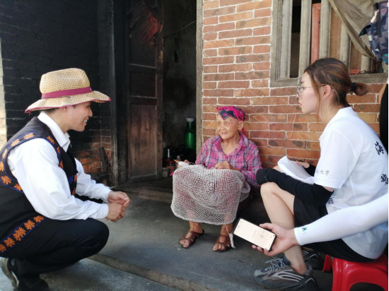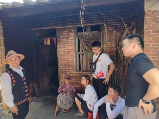 调研团随后对一位年龄高达93岁的苗族阿婆进行采访。据村民委员会主任介绍,阿婆的孙子现在是在伍军人,而她自己也是黎苗两族共同抗战时期的一批年轻人。调研团同阿婆和村民委员会主任的交涉过程中进一步发掘了部分藏在老一代记忆深处的关于抗战年年间的故事。加脑苗寨的地理位置十分特殊,它被三座大山围靠且傍邻万泉河,形成了一处天然的隐蔽堡垒,而琼崖革命时期海南省的形势十分严峻,加脑苗寨凭借其优越的地理环境,保护了战时受伤的革命军人。当时革命军决定在这里建立后勤医院,主要用于救治和收留伤员,在反革命势力的围剿中,革命军给予的信任与保卫中国的奉献精神让加脑苗寨村民不惜牺牲自己的生命也要去保护后勤医院,即使到了何种地步也绝不透露后勤医院地址一丝一毫的消息。不屈不挠的精神加之共产党的领导,革命战争最终胜利,而加脑苗寨的苗族村民们也为会山镇最后的革命胜利作出了不可磨灭的贡献。在老人的家中,可以看到象征着优秀共产党员——“光荣军人”的称号及悬挂在大门旁令人心生敬畏的“光荣之家”牌匾。通过苗族阿婆与村民委员会主任的叙述,这些极其具有纪念意义的标志顿时生动鲜活了起来,历史的场景似乎从眼前闪过,调研团对加脑苗寨苗族村民对过去革命胜利和如今苗寨安定生活所作出的贡献有了更深入的理解。