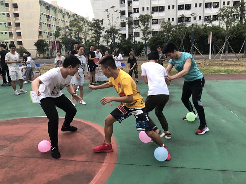 趣味活动正式拉开序幕。本次活动总共设置了七个趣味游戏;萝卜蹲、正话反说、夹乒乓球、吹气球、盲人背瘸子、踩气球、背对背运球等等。在众多的项目中,最难的项目莫过于夹乒乓球,因为只要稍不留神,乒乓球便被风带走了,吹走了球留下来人,而留下的参赛同学只能风中凌乱。而盲人背瘸子的活动也同样给大家带了无尽的欢乐,有人直达终点,也有人偏离轨道,但不变的是那阵阵笑语、欢呼雀跃。活动正如火如荼地进行着,可惜天公不作美,瓢泼大雨仅用几秒就占据了我们的游戏场地,尽管如此,还是有一组同学坚持完成了他们“萝卜蹲”的游戏,最终如愿以偿地拿到了他们的奖励。