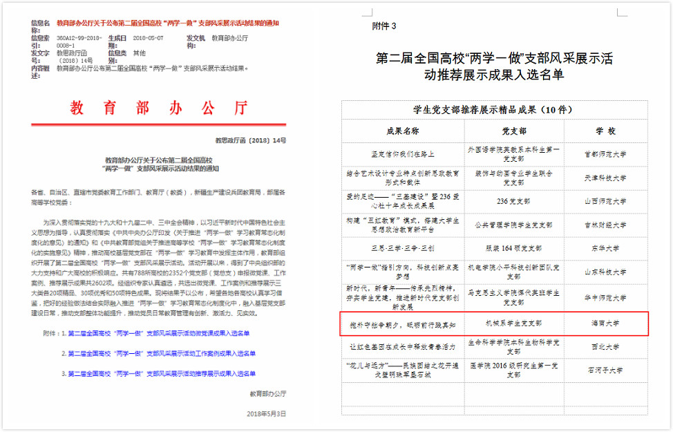 据悉,教育部组织开展的第二届全国高校“两学一做”支部风采展示活动,共收到788所高校的2352个党支部(党总支)的微党课、工作案例、推荐展示成果2602项,经专家认真遴选,学生党支部中共选出微党课、工作案例、推荐展示三大类各10项精品、15项优秀和25项特色成果。