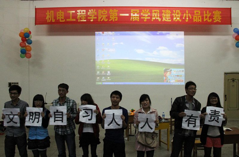 为了推进我院学风建设工作,积极倡导和努力培养优良学风,营造良好的学习氛围,形成好的学习风气。我院于12月6日晚7:30在儋州校区47课室举办了学风建设小品大赛。比赛得到了同学们的积极响应,共个7班级、3个系党支部参与比赛。机械系梁栋副主任、学工办崔建兵、姚广龙、孙佑攀等老师出席并担任评委,和我院四百多名学生一同观看了比赛。