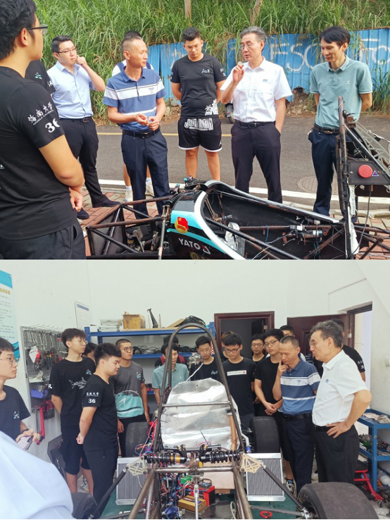 会后各位领导与车队队员于研发楼副楼合影留念,随后参观了车队设计和装配实验室,重点参观并点评了新旧赛车。最后闫建来先生表达了对车队未来发展的殷切期望。