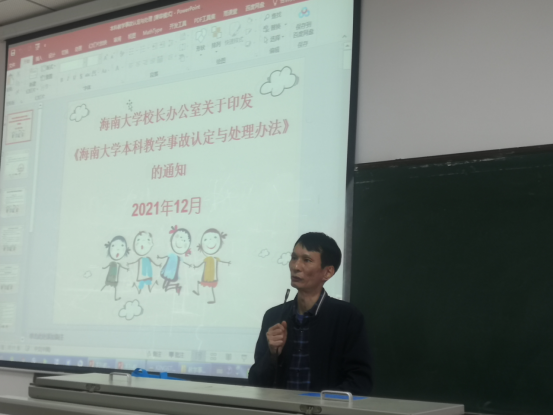 首先,学院主管教学的副院长陈振斌在会议上强调老师们要按照《海南大学本科教学事故认定与处理办法》的通知》(海大办〔2021〕74 号),维护学院正常教学秩序。学院安排教务办主任范杰在会议上给全体老师们解读了《海南大学校长办公室关于印发《海南大学本科教学事故认定与处理办法》的通知》(海大办〔2021〕74 号),重点对教学事故的认定范围与等级,海南大学教学事故分类与级别一览表进行了逐条解读阐述。
