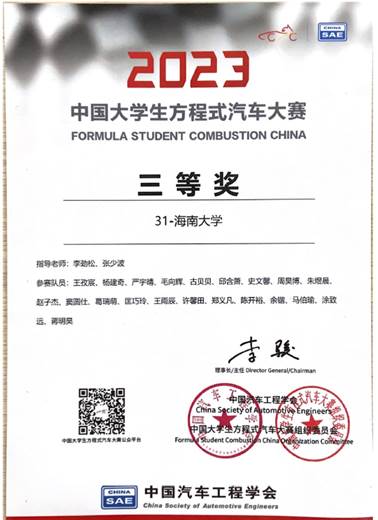 我院南海方程式赛车队携第四代赛车亮相2023FSCC,不仅在高速避障测试中拿下了1:07.62的优秀成绩,而且在赛场上展现了队史最佳的动态性能,耐久赛最快圈速为1:01.791,位列全场第十,实现了赛车在动态项目的新突破。经过五天的激烈角逐,我院南海方程式赛车队获得2023年中国大学生方程式汽车大赛三等奖。